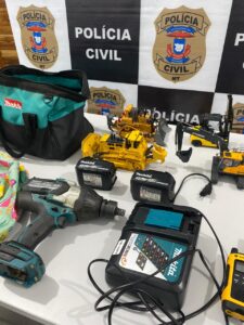 Dentro do barracão, a polícia encontrou diversos equipamentos utilizados para arrombamento, como pé de cabra e ponteiras, além de ferramentas ainda com etiquetas compatíveis com os produtos furtados de uma loja no dia anterior.