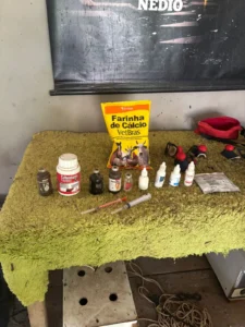 No local, os agentes encontraram 24 galos com ferimentos e mutilações, baias separadas e materiais usados nas brigas, como lâminas artificiais e anabolizantes. A perícia da Politec confirmou os maus-tratos.