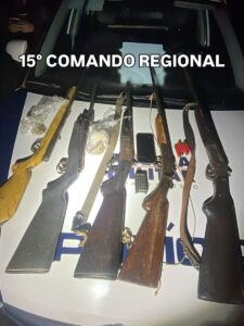 Durante a abordagem, os policiais apreenderam cinco espingardas, diversas munições e uma grande quantidade de substância análoga à maconha. Dois homens, de 42 e 64 anos, foram detidos e conduzidos à delegacia.