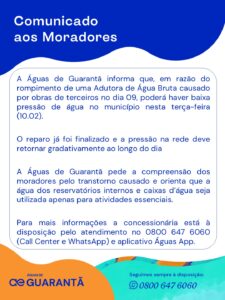 A Águas de Guarantã pediu a compreensão da população pelos transtornos causados e reforçou que permanece à disposição para esclarecimentos por meio do 0800 647 6060, que atende por telefone e WhatsApp, além do aplicativo Águas App.